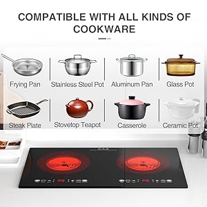 - All Cookwares: Electric stove can meet the needs of various pots, such as iron, aluminum, ceramics, stainless steel, copper, heat-resistant glass, as long as it is a pan, it can be heated on it. Any problem please contact us anytime.