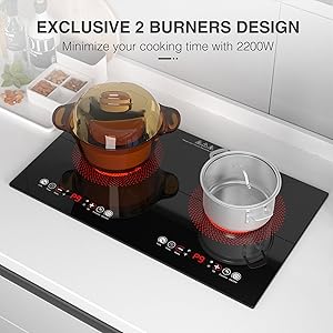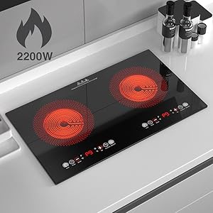 - Double Heating Burners: The double electric cooktop features two independent heating areas and independent LED display. Each burner is 1100W which can cook 2 dishes quickly at the same time. The electric cooktop uses 110-120 Volts of electricity—standard in all North American homes.
