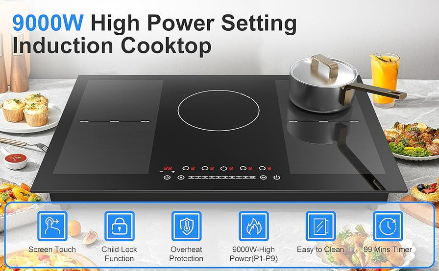 Wide Temperature Range: This 9000W High Power Induction stove top offers a wide temperature range of 80°C to 270°C (176°F to 518°F,Even heat distribution.The 30"Induction cooktop is designed with a flex zone, the area can be used as a large area or as two burners, depending on your cooking needs.Built-in Cooktop needs to be connected to hard wired(220-240v).