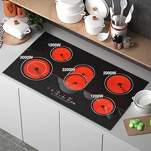 - 【5 Powerful Cooking Zones】This 36 inch electric cooktop is suitable for AC 220-240V, featuring 5 different cooking zones with total power 8600W (1200W *2 + 2000W *2 + 2200W power). Built-in Ceramic Hob 220-240v hard-wired, need a professional electrician for wiring.