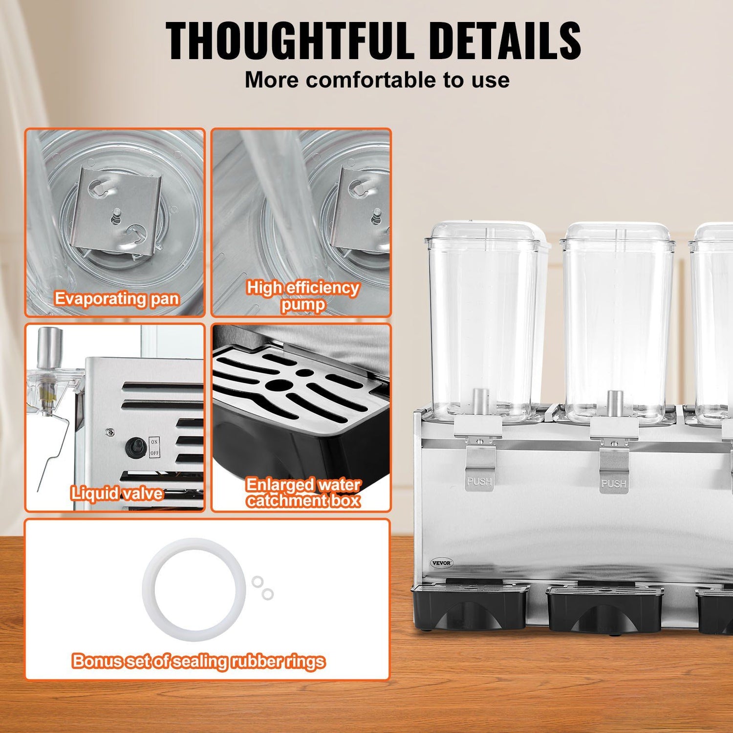 Large Capacity: This commercial beverage dispenser has a capacity of 20.45qt/ 18L per cylinder, a total of 3 cylinders, which can accommodate a large volume of beverages. The rubber sealing pad prevents beverage leakage.