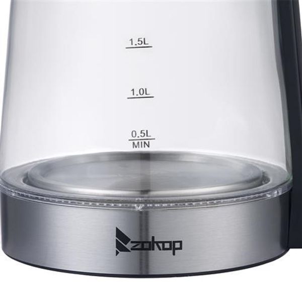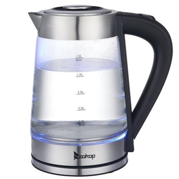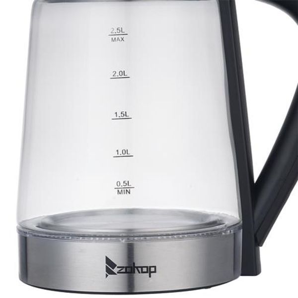 ZOKOP HD-250 110V 1200W 2.5L Electric Kettle with Blue Glass is the perfect blend of elegance and functionality. Not only is this kettle a beautiful addition to any kitchen countertop, but it also boils water efficiently, saving time and energy over the use of conventional stovetop kettles. Their unique, modern, and stylish design looks great on any counter top. A halo of LED lights beautifully illuminates the pot when it's in use, so it's not only practical, but very attractive to look at. In a matter of minutes, hot water will be ready to use for instant coffee, tea, hot cereal, instant macaroni, soup, or oatmeal.