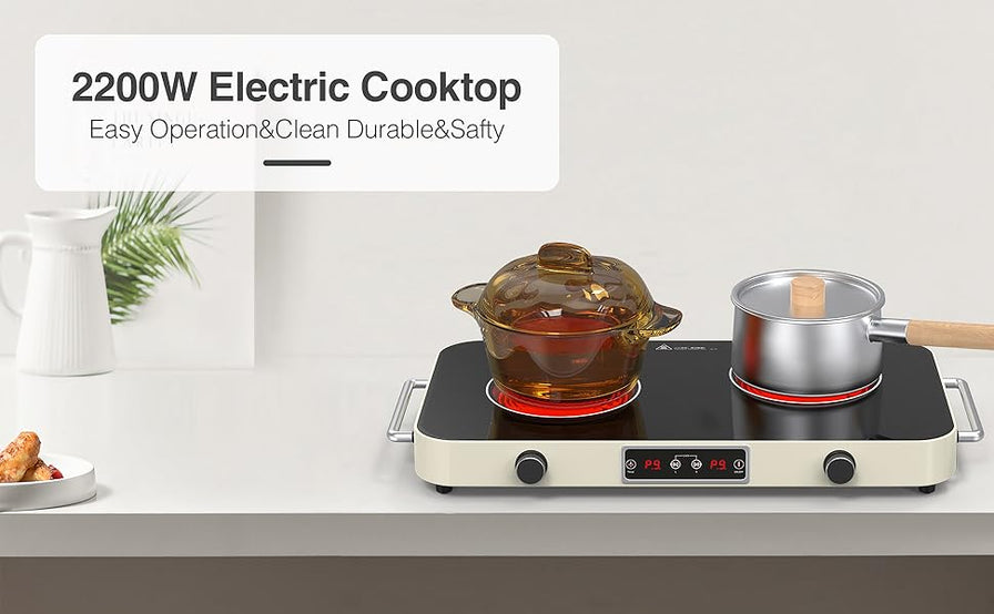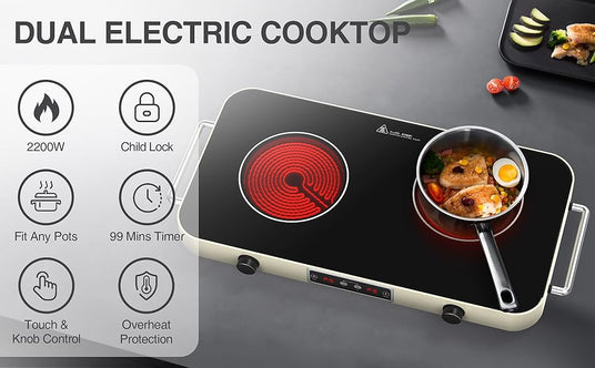 2 Burner Electric Cooktop 12 Inch 2200W Infrared Cooker with Knob control and handle
