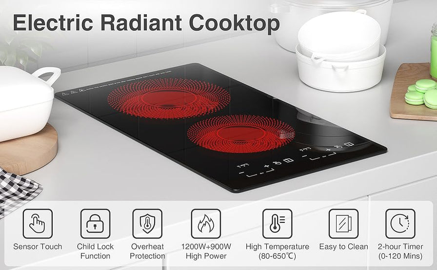 Plug In 2 Burner Electric Cooktoop 12 Inch 2100W Infrared Cooker with Touch Control