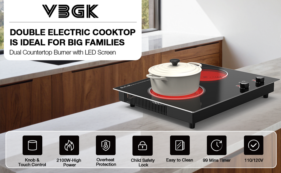 VBGK Electric Cooktop, 110V-120V Double Burner Electric Cooktop, 2100W Built-in & Countertop Electric Stove Top with plug,9 Heating Level, Timer & Kid Safety Lock, LED Touch Control, auto shutdown, over-temperature protection.