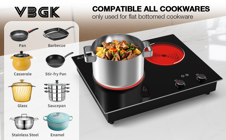 Built-in & Countertop Electric Stove: VBGK 2 Burner Electric cooktop can quickly fry,The hot plate can be built-in or countertop, easy to install,The round edges with no sharp corners design is stylish and safe. The surface is made of black ceramic glass, which is scratch-resistant, wear-resistant, high temperature resistant, you can use it in home, kitchen, apartment, RV, office great for everyday use in your parties.