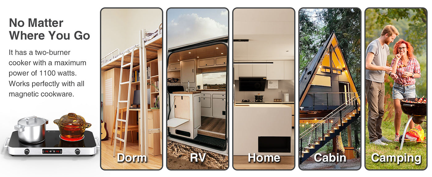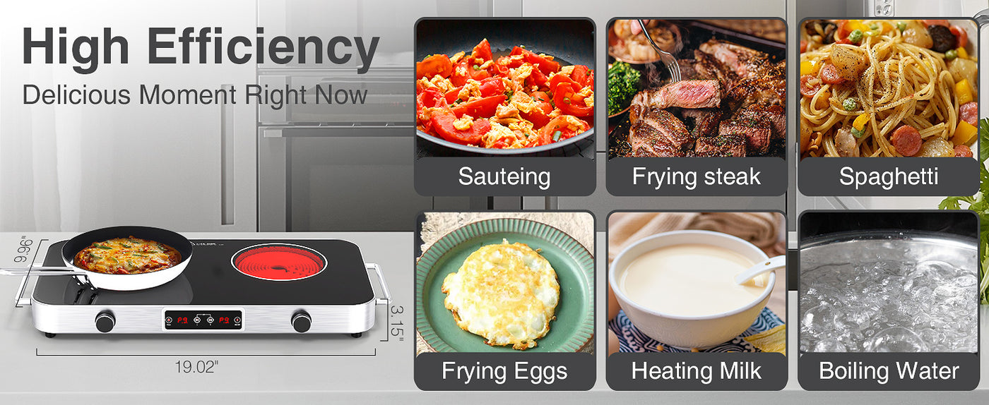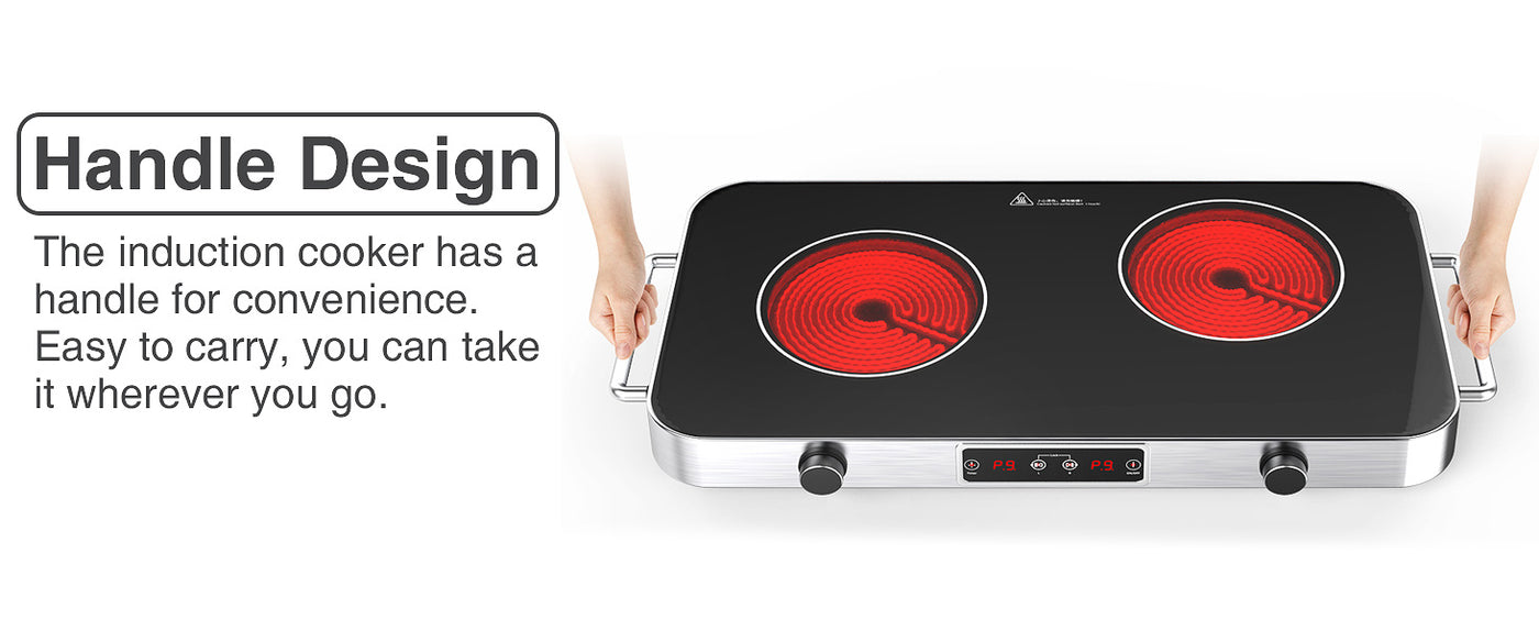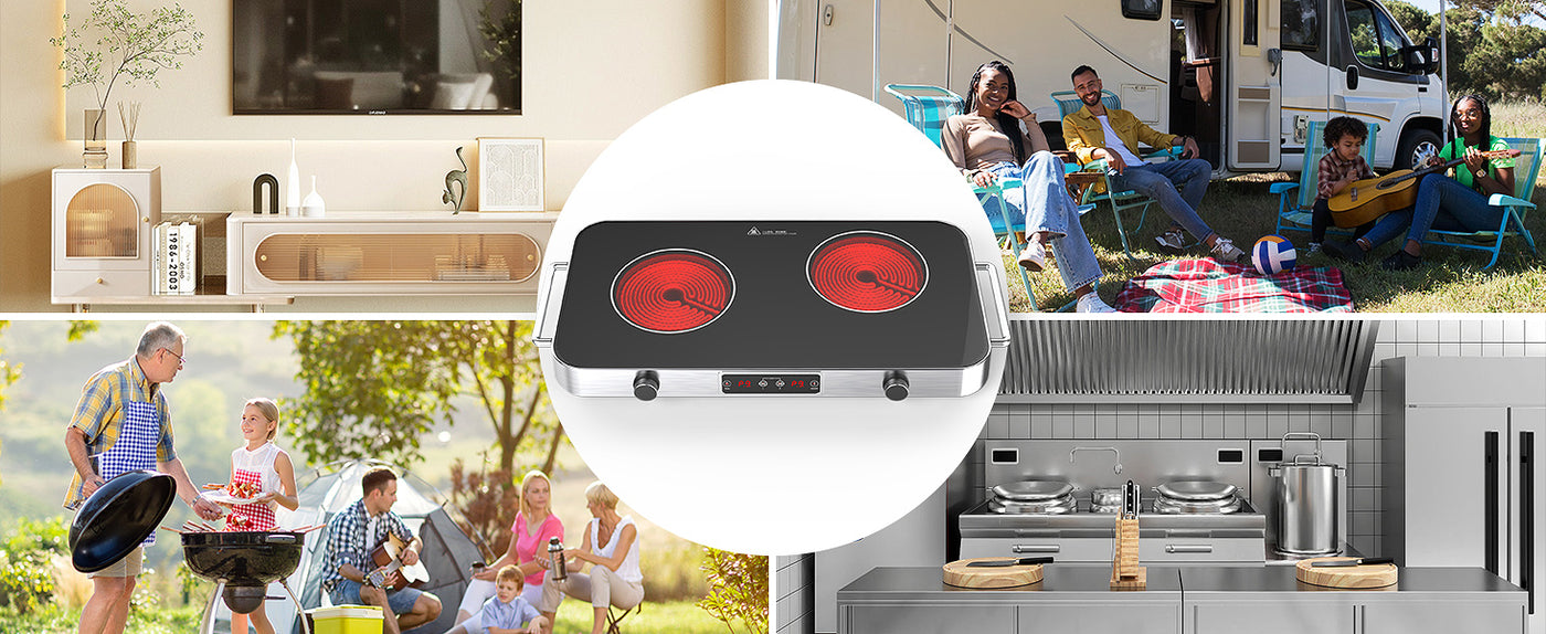 - Portable and Wide Application:VBGK Cooktops Without the need of gas supply and with the small space occupation, the double electric cooktop is very convenient for you to move it to any place you like. And this portable stove is ideal for office use, camping, parties, boats, RVs, student accommodation, traveling or as an extra cooking utensil in your kitchen.