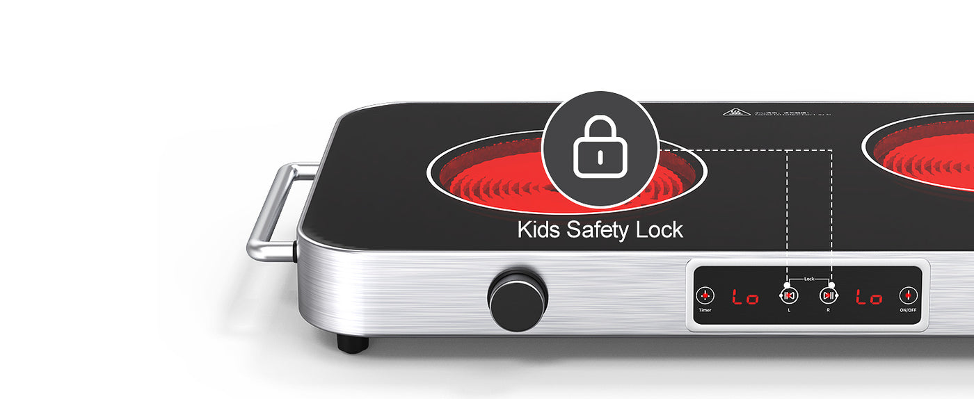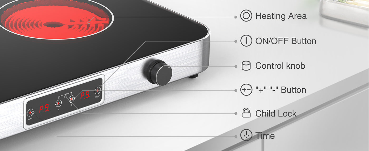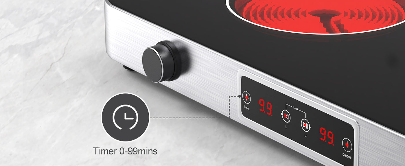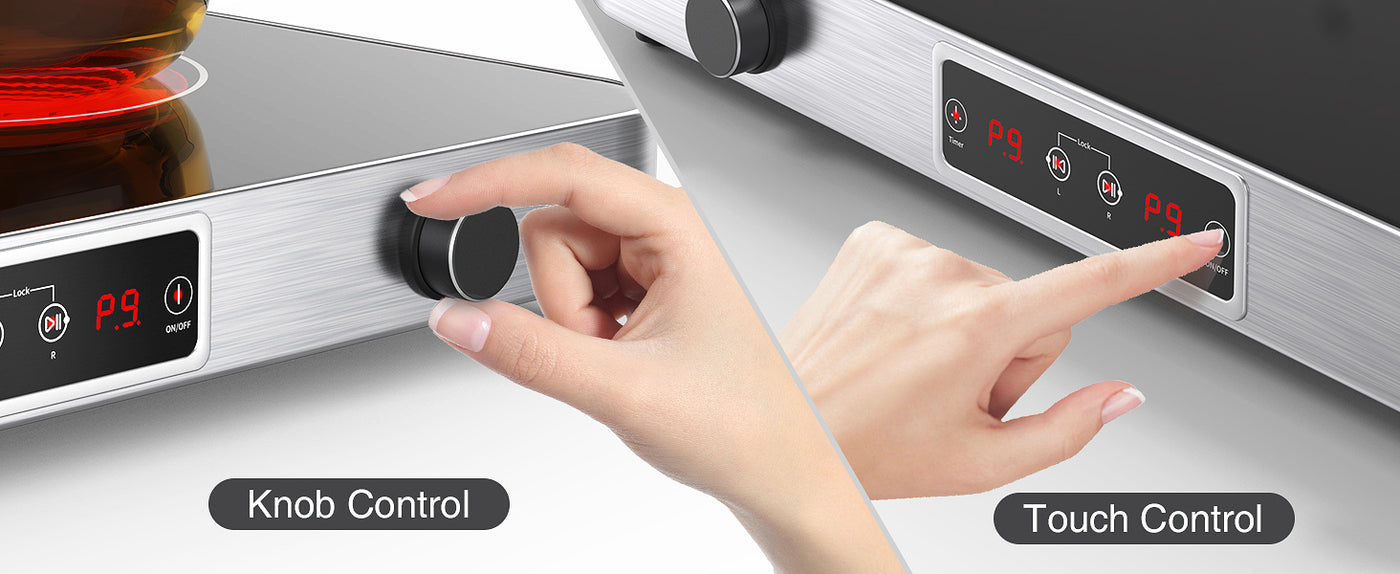 - Sensor Touch & Knob Control:The Electric stove top panel can be touched slightly to choose cooking mode, turn on child lock or set timer. cooktop knob is used to adjust 9 power levels and 99 mins timer. As you set up a 99mins timer to turn off automatically when the cooking completes.