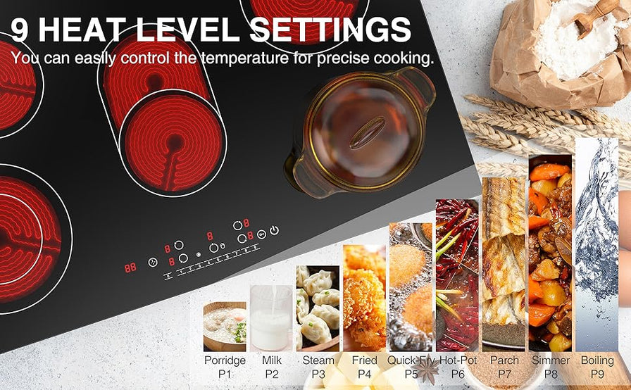 • 【9 Heat Level Electric Cooktop 】9 Power Levels, giving you greater control over Cooking Temperature with the powerful 8.6kW, meet all your needs of delicate heating accuracy. With an electric stove top, you can control the temperature more precisely than with gas or electricity. This better temperature control delivers consistent results, reducing the risk of over or under-cooking.