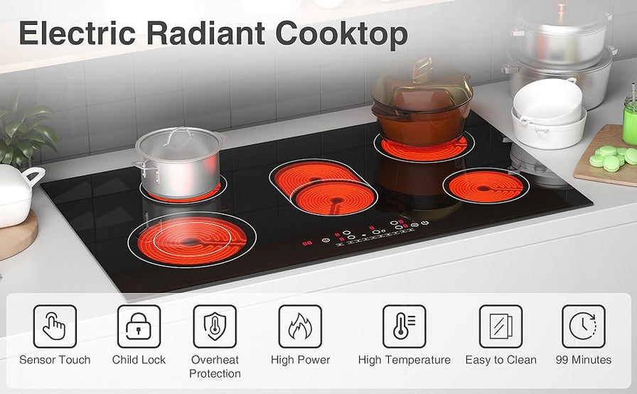 35.4 inch electric cooktop is equipped with 5 burners, cooking power levels from 1200W to 8600W; Easy temperature control meets various cooking requirements, including boil, fry, stew, etc.