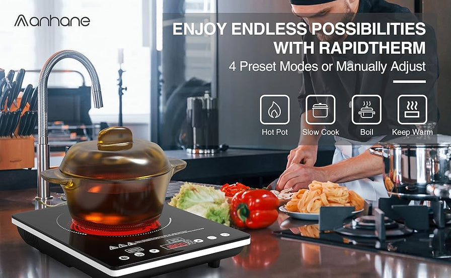 - 【Efficient Heating】The portable electric cooktop adopts infrared heating with 9 levels of power (200W-1800W) and 9 levels of temperature adjustment (176℉-510℉), which can be adjusted according to different ingredients for cooking freedom.