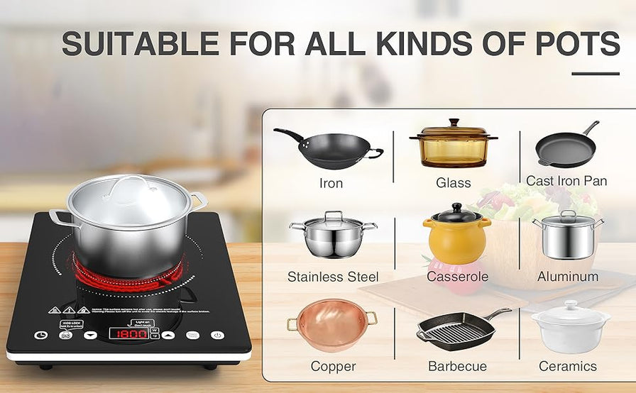 - 【Compatible with All Kinds of Kitchenware】The electric cooktop uses infrared rays for heating, so you don't have to worry about the suitability of your pots and pans, and you can choose your favorite pots and pans for cooking.