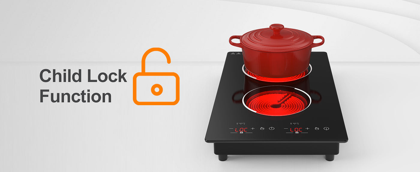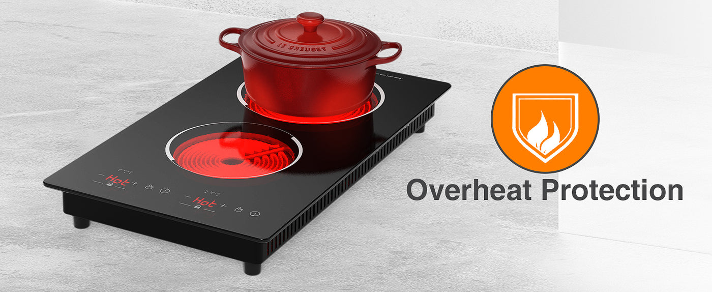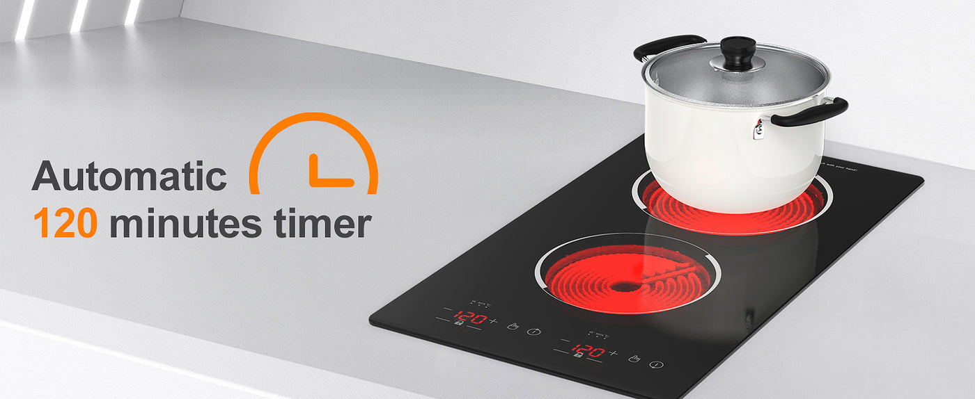 • Safety Double Burner Electric Cooktop: VBGK 2 burner electric cooktop is equipped with a child safety lock, timer and overheat protection device, and the round edges without sharp corners. Set the timer from 1 minute to 120 minutes. Just set the power setting and timer, then let the electric stove top do the rest, and you can enjoy the leisure time and its excellent cooking performance.