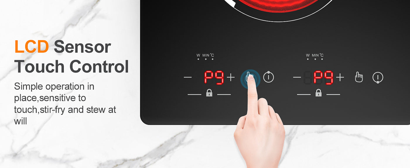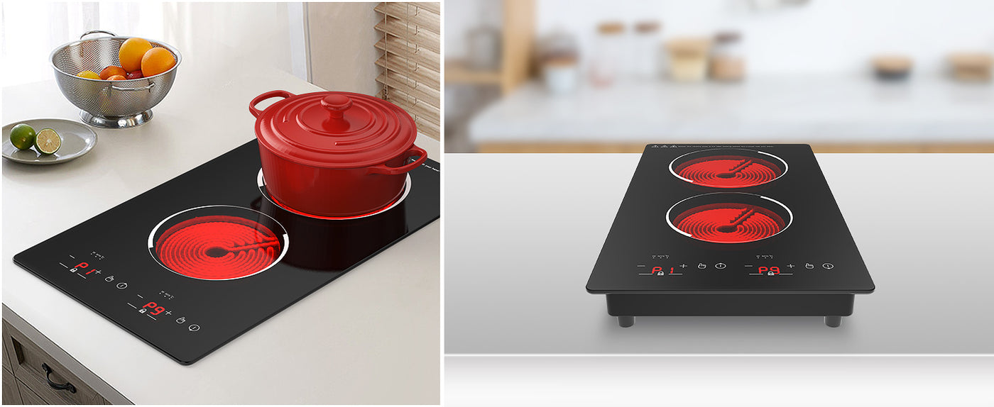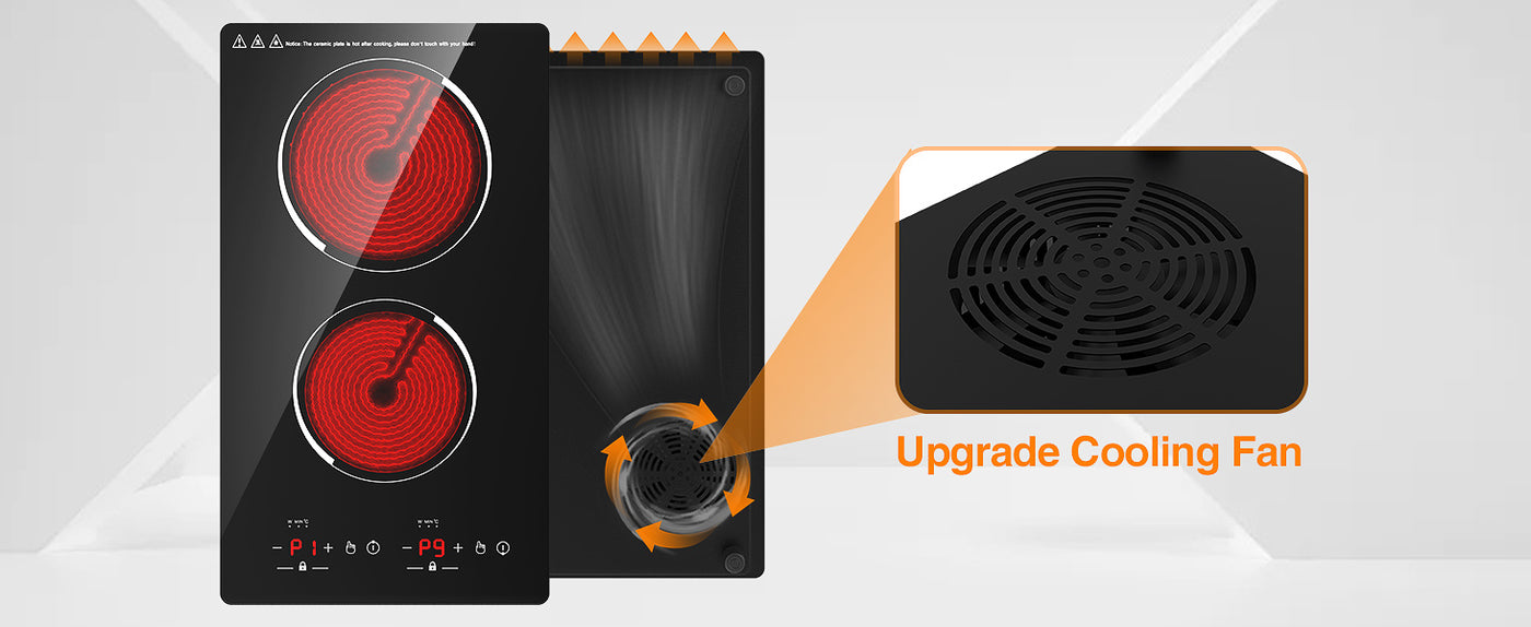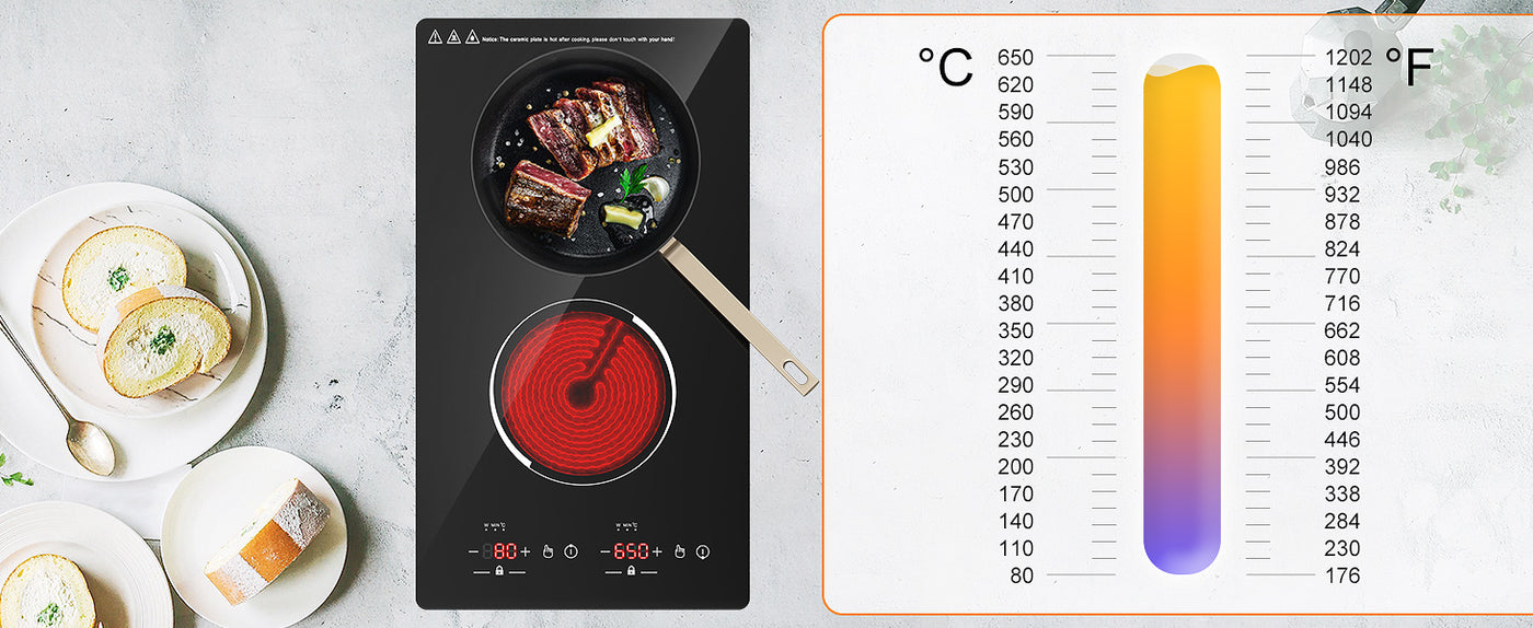 This 12'' electric stove top is equipped with two independent heating zones, allowing you to set each heating zone separately using the LED display. Independent power 1200W+900W, which can quickly cook 2 dishes of delicious dishes at the same time, saving a lot of time.