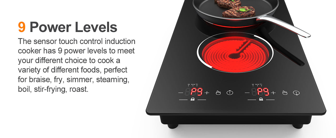 VBGK 12 inch two burner electric cooktop has 9 power levels to meet your different choice to cook a variety of different foods, perfect for braise, fry, simmer, steaming, boil, stir-frying, roast. The electric burner has 20 temperature settings, ranging from 80°C to 650°C. You can effortlessly adjust the settings and choose desired power level with the sensor touch.