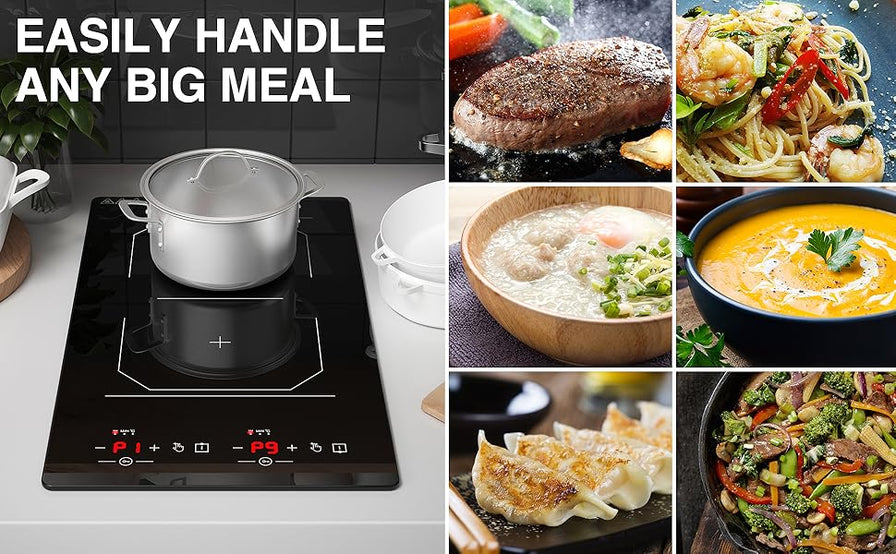 đăConvenient to ControlăThis double induction cooktop has 9 power levels and 2300W power to choose from. Meet all your cooking needs: heating, steaming, frying, deep-frying, hot pot, grilling, boiling, and roasting. The maximum power of the upper zone is 1200 watts, and the maximum power of the lower zone is 1100 watts. Ensure fast cooking and time-saving in daily life.