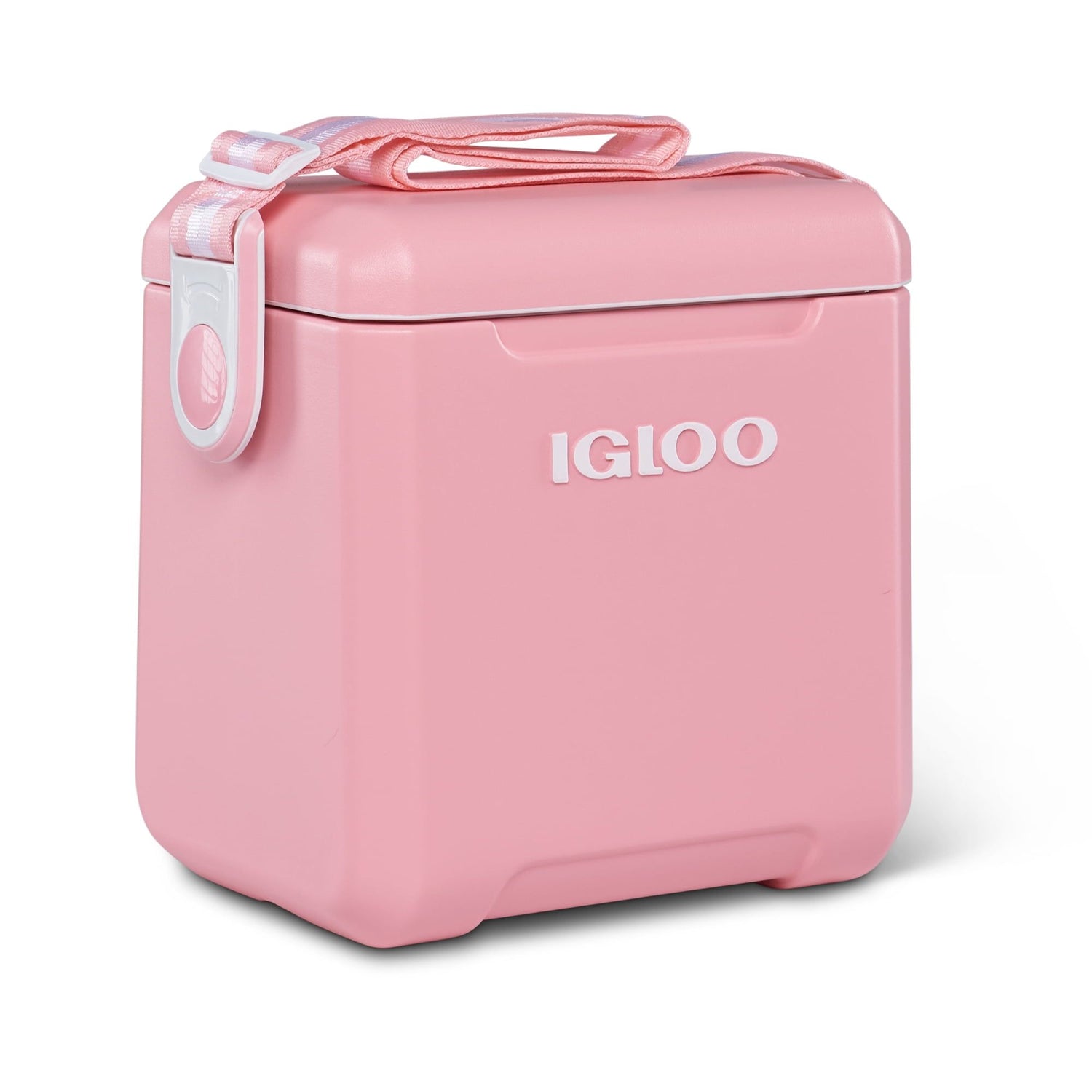 We brought carefree back! With the Igloo Tag Along Too cooler, we put a modern twist on an Igloo classic. Designed with more style and ease than ever, this cube cooler comes in a rainbow of fun colors and features a stylish, adjustable strap for hands-free carrying. Lid locks at each side and features an interior gasket seal that prevents spills and leaking. MaxCold insulation provides up to two days of ice retention. Spacious enough to hold sports drinks and bottles upright. Hinge detent feature keeps the lid open until you shut it closed. Made of Polyethylene. Item number 32659.
