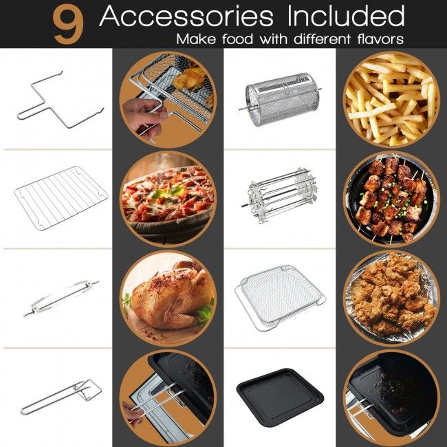 9 Accessories and Low Maintenance: There are 9 accessories in the package for wide application, including fetch tool, baking cage, 2pcs wire rack, rotating basket, rotisserie shaft, mesh basket and tray handle and dripping tray.