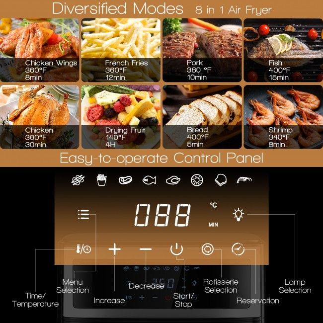 With 8 preset cooking menus; this air oven provides you with a variety of cooking options. And you can make chicken wings; french fries; pork; fish; poultry; drying fruit; bread and shrimp to fulfill your needs. The adjustable temperature(120°F-400°F); 1700W powerful motor and 360°rapid air circulation function cut fats while keeping the same great taste. Besides; the clear control panel allows you to adjust the cooking modes; temperature and time (1-60min) (dry fruit function for 12 hours) conveniently. 9 accessories in the package let you clean it with water and detergent.