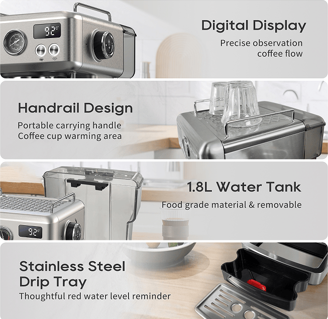 This semi-automatic machine adjusts the coffee volume, extraction temperature, steam temperature, and pre-soaking time. Rich programming features help you adjust the acidity and bitterness of your coffee. Even with different flavors of coffee beans, this programmable coffee machine can help you develop their aroma.