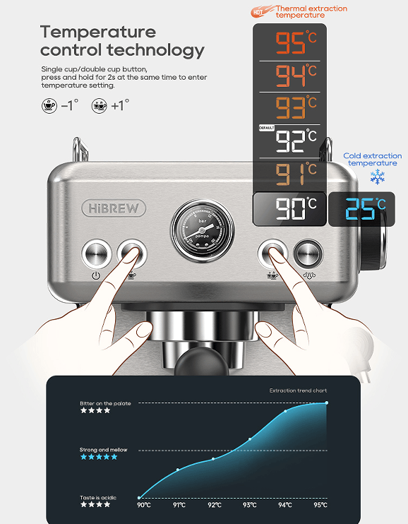 Available in single cup capacity of 35-150ml, double cup capacity of 70-300ml; Hot extraction temperature range 90-95°C, cold brew temperature range 25°C; Steam temperature range 125-150 degrees Celsius; Pre-infusion time range 0-10 seconds; Temperature display conversion: Celsius and F can be converted to each other.