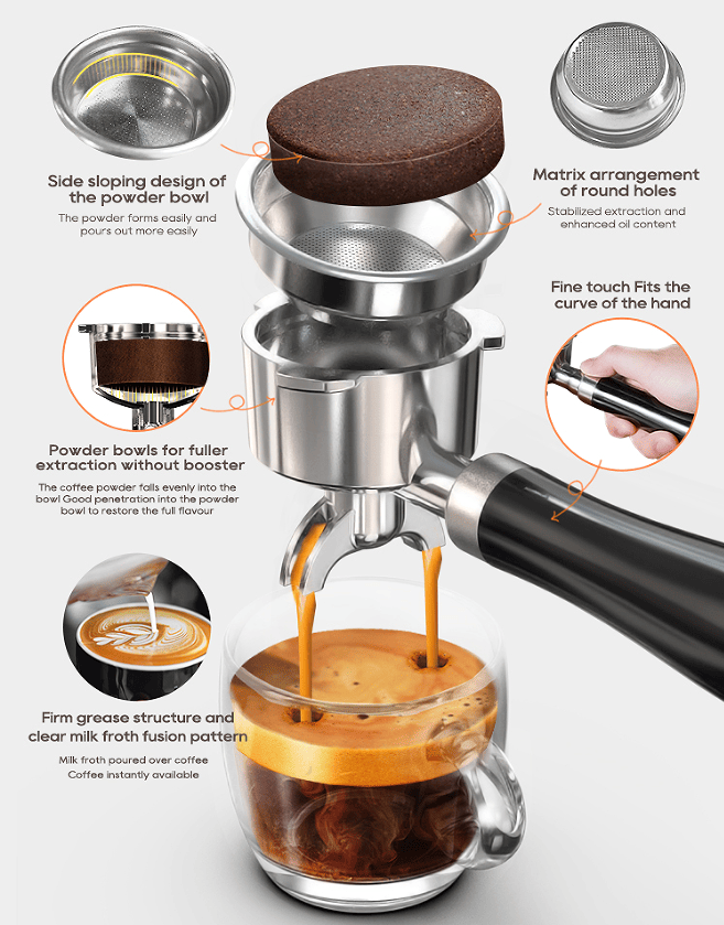Pressure 20 bar: The H10A uses a powerful 20 bar high-pressure pump and a uniform wet pre-soaking technique to ensure a complete extraction of the coffee foam. It uses a durable brushed stainless steel shell, stable structure, antifouling and easy to clean.