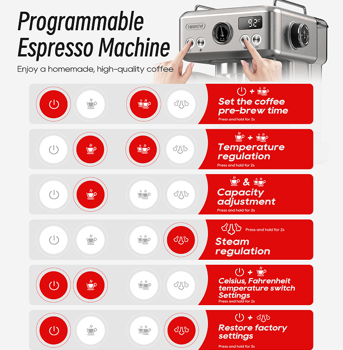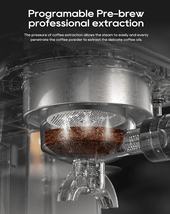 Professional programmable function: This semi-automatic machine can adjust the volume of coffee, extraction temperature, steam temperature and pre-soaking time. Rich programming features help you adjust the acidity and bitterness of your coffee. Even with different flavors of coffee beans, this programmable coffee machine can help you develop their aroma.