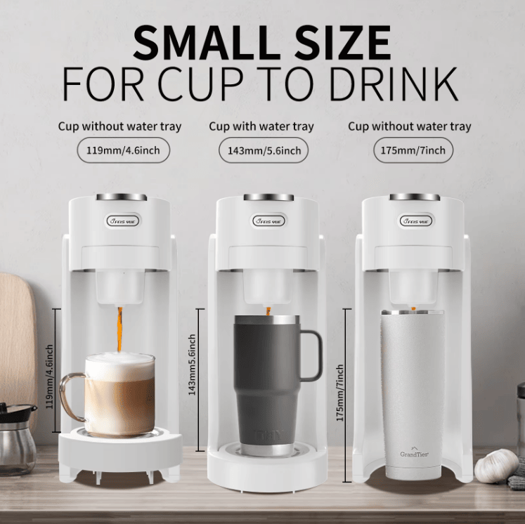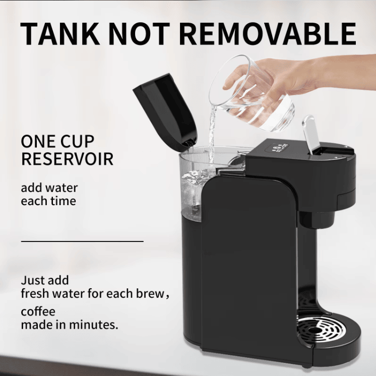 Compact Capsule coffee maker and comes with a detachable 900 ml BPA free water tank. Adapt to 119mm, 143mm, 175mm height thermos cup or mug three keys, power keys, large and small cup keys