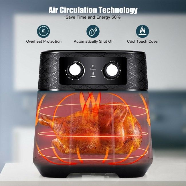 With the recipe guidance; you can make gourmet food by yourself. Featuring 360° hot air circulation technology and large capacity; our air fryer oven allows you to enjoy food together with your family. Easy to use temperature and time control knob is perfect for those who tend to cook their own recipes. Add this 5.3 QT oil-free air fryer to your list and say goodbye to your separate appliances!