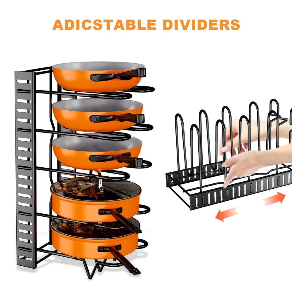 A multifunctional kitchen storage box with 8 levels for cookware storage. It allows you to customize the height of each level to fit various sizes of POTS and pans. This rugged potholder is made of durable iron with a black finish that resists rust and ensures long-lasting performance.