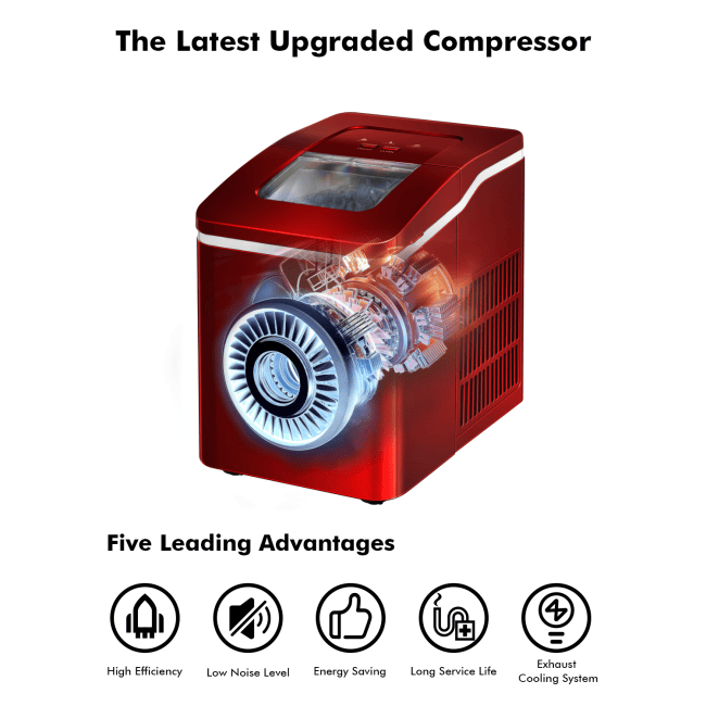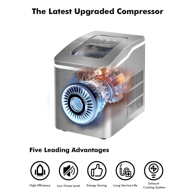 Quiet Operation: Coming with 45 dB low noise operation, this electric ice making machine will not disturb your daily work and activity while achieving low consumption. And the evaporators are made of pure copper with plating which is highly efficient and durable.