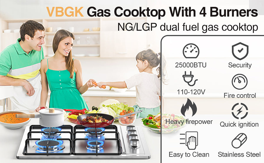 - Drop-in Design Gas Stove 4 Burner: VBGK Gas cooktop 30 inch is equipped with four high-powered sealed burners, more stable-performance and higher efficiency.4 burners Heat, Fast Burner 1 x 9500 BTU; Semi-Rapid Burner 2 x 6000 BTU; Auxiliary Burner 1 x 3500 BTU; Total Power of 25,000 BTU. Suitable for frying, steaming, slow-cooking and quick-frying, meet your needs for cooking multiple dishes at the same time.