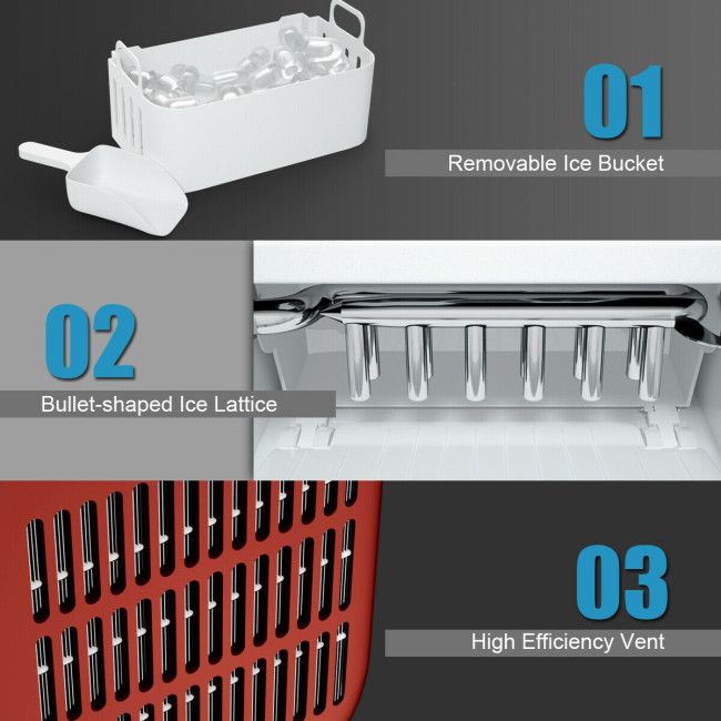 Adopting a quiet and high efficient compressor; the ice machine is lower noise; rapid cooling; low power consumption; making 44 lbs of bullet-shaped ice cubes per 24 hours. It is made of safe and odorless ABS and PP material; harmless to human beings; and will serve you for a long time. It is worth mentioning that the ice maker features a self-cleaning function; which greatly facilitates your daily cleaning and maintenance work. Additionally; the optional bullet shape ice size meets your different needs for ice.