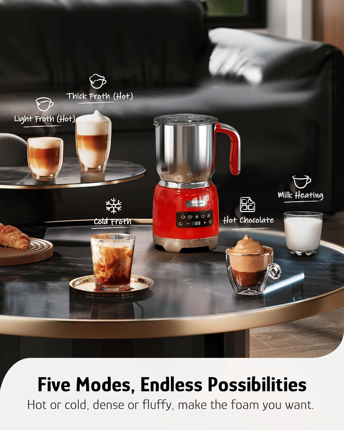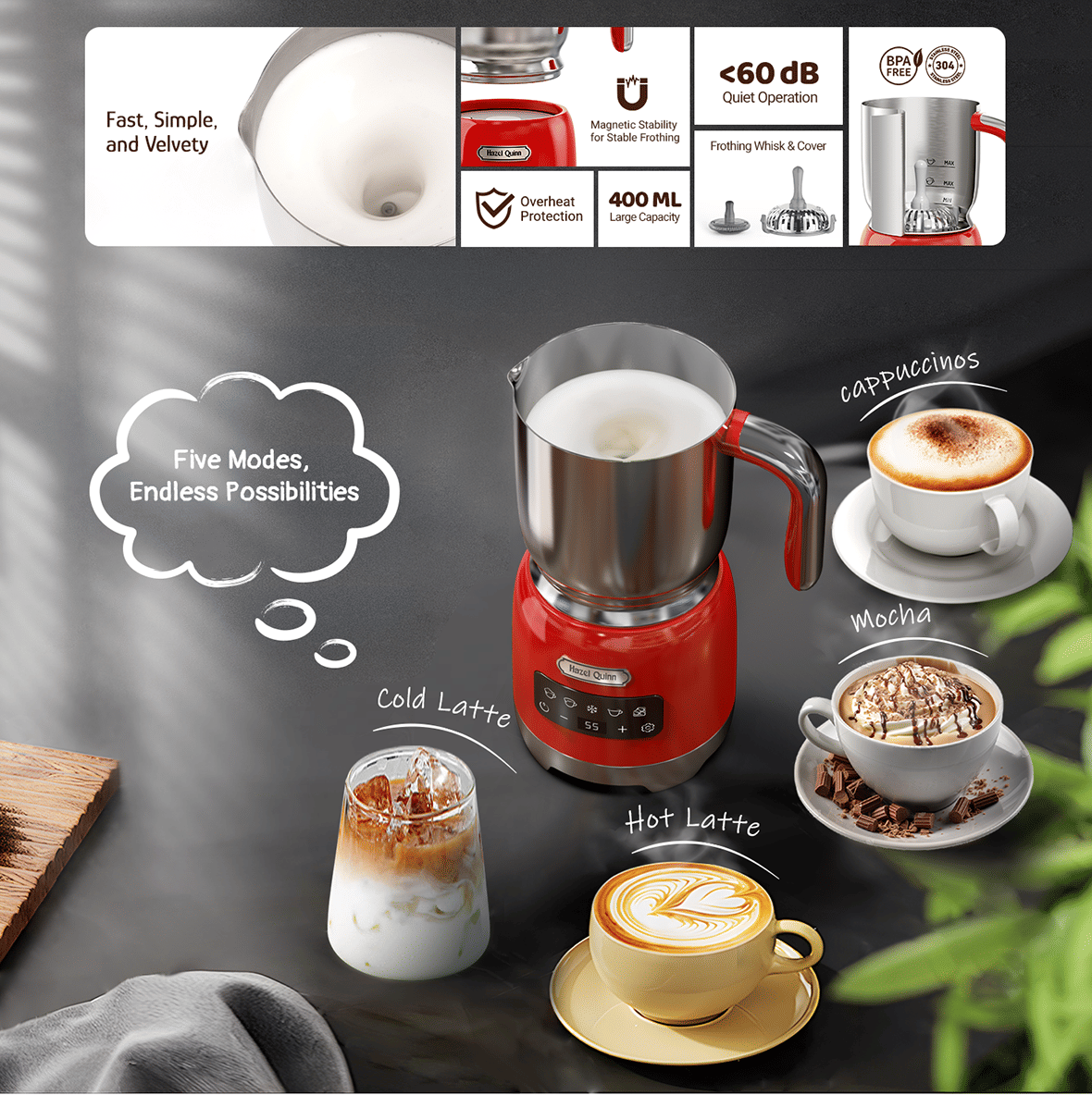 5in1 Ruby electric milk foam 5 settings Cold foam hot foam hot air foam Hot milk or hot chocolate LED touch control 400ML/13.5oz cold and hot latte, cappuccino 360°