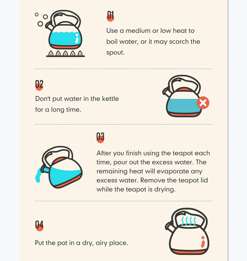 Big Whistle Kettle: This whistling teapot has a tight lid that keeps steam in the hot teapot to heat up quickly, and alerts you when the water is boiling to prevent the kettle from boiling dry.