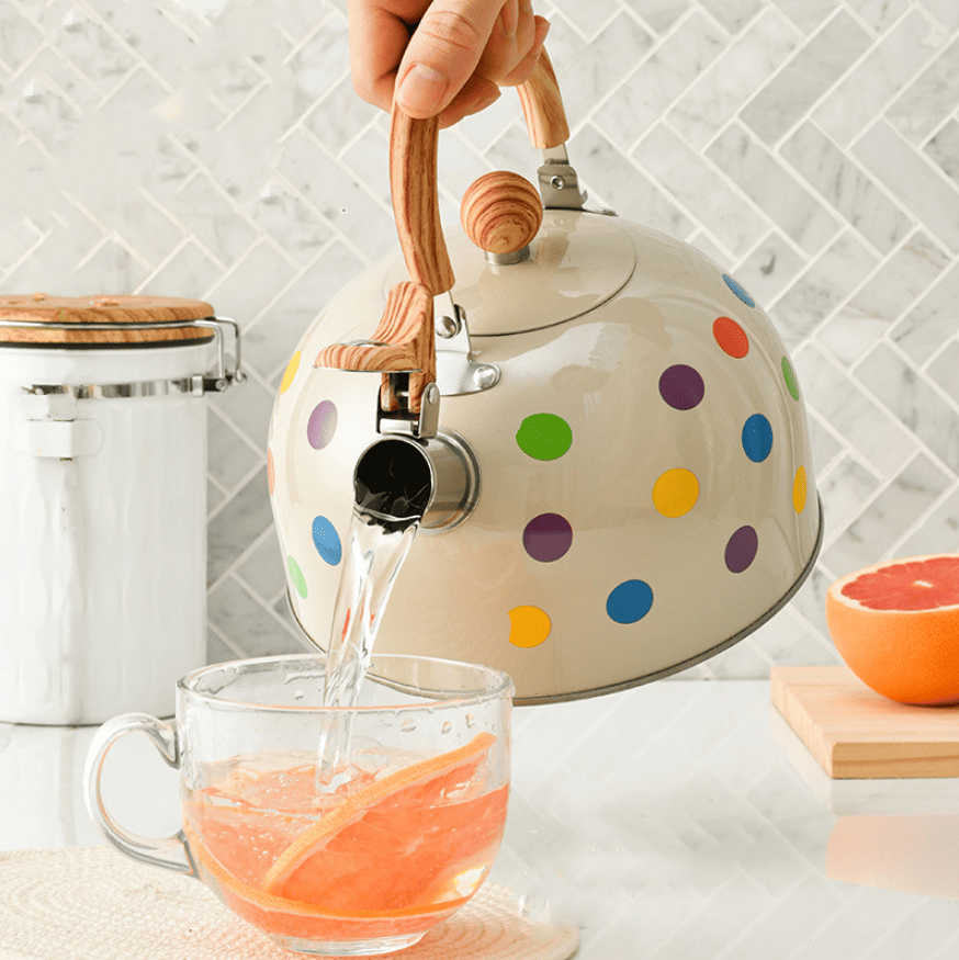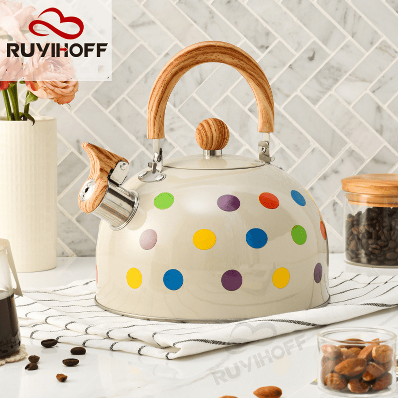 SKU: BDH213A3L, rice white wave point honking kettle electromagnetic cooker whistle kettle 3L large capacity hot kettle without BPA fast boiling 10-12 minutes gas stove kettle spray color sound kettle, open fire stove kettle high efficiency heat guide kettle, fast boiling kettle, European light luxury retro wood grain handle stainless steel boiling kettle rice white wave point European and American kitchen utensils
