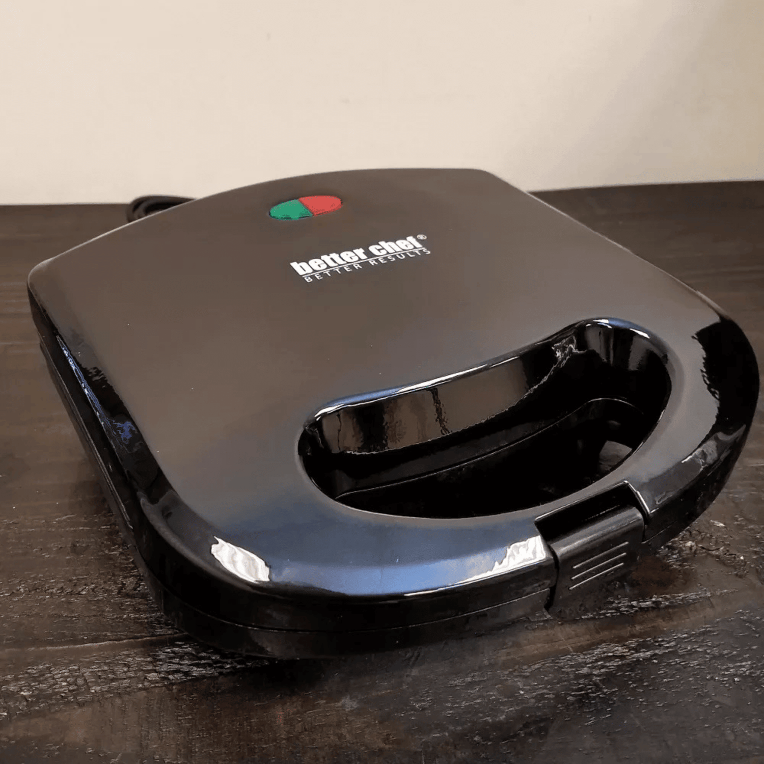 This Better Chef double sandwich maker features a non-stick cooking surface, facilitating easy cleanup after use. It can grill up to 2 sandwiches or hot pockets within minutes, offering a quick and convenient meal option. When not in use, it stands upright for easy storage, saving space in your kitchen. On/Off/Ready indicators provide clear signals during the cooking process. Additionally, it boasts a cool-touch exterior, ensuring safe handling even when in operation. The cord storage feature helps keep the cord neatly organized when the sandwich maker is not in use, further contributing to its convenience and tidy appearance on the countertop.