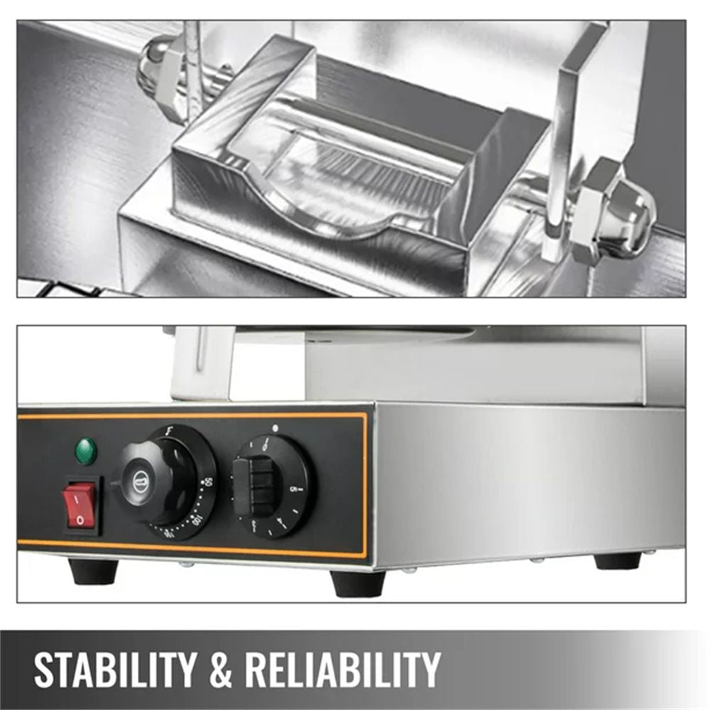 Our electric egg roll maker is composed of a stainless steel body and cast-aluminum heating plates with non-stick Teflon coating. It is durable; sturdy; and easy to clean; serving you for a relatively long time. It is equipped with an internal temperature protector; which is reliable and secure to operate. Temperature is 50-300℃ (122-572℉) adjustable; and the countdown timer can be set within 5 minutes. With the advantages of clean; sanitation; smooth operation; and energy-saving; our professional waffle machine is ideal for both commercial and household use.