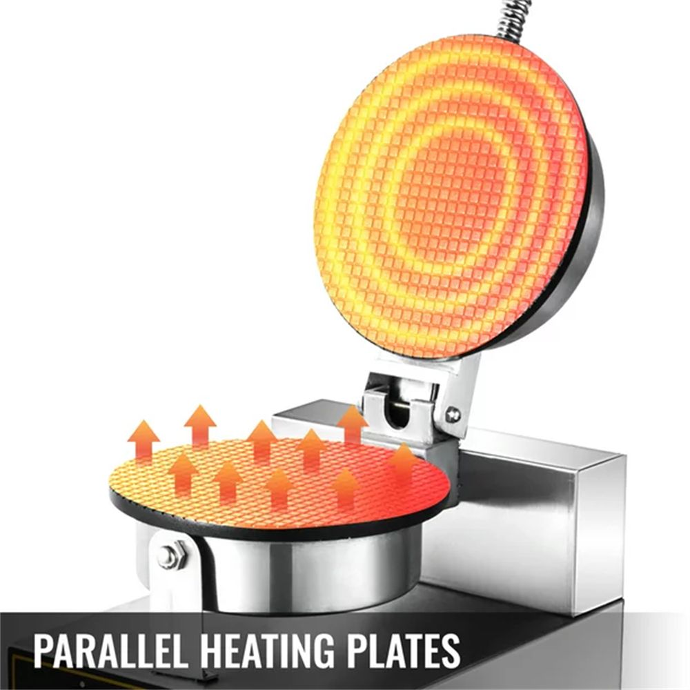 Efficient Parallel Heating: Our waffle cone maker machine is composed of two heavy-duty cast-aluminum heating plates; measuring 7.9 inch in diameter. The parallel heating design enables both sides of the cone waffles to be baked evenly. Both of the heating plates are coated with non-stick Teflon; from the comfort of which you can take the waffle cones off smoothly.