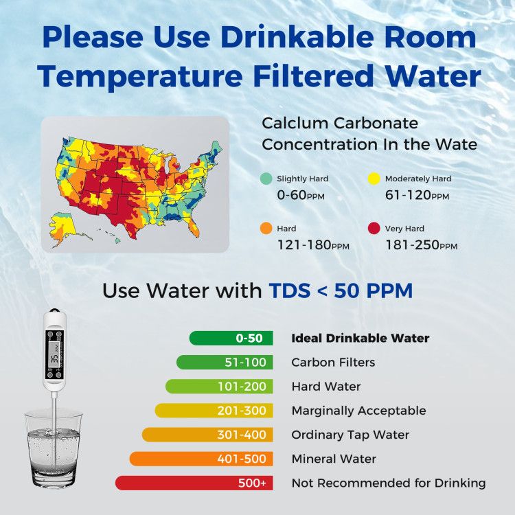 2 Different Ways to Refill Water: You can choose to manually add water into the 2.3L water tank or automatically add water through 1 4ft water inlet pipe. In manual mode, the water level shall not exceed the maximum water level line in the liner (MAX mark). Tips: The recommended water is the drinkable room temperature filtered water.