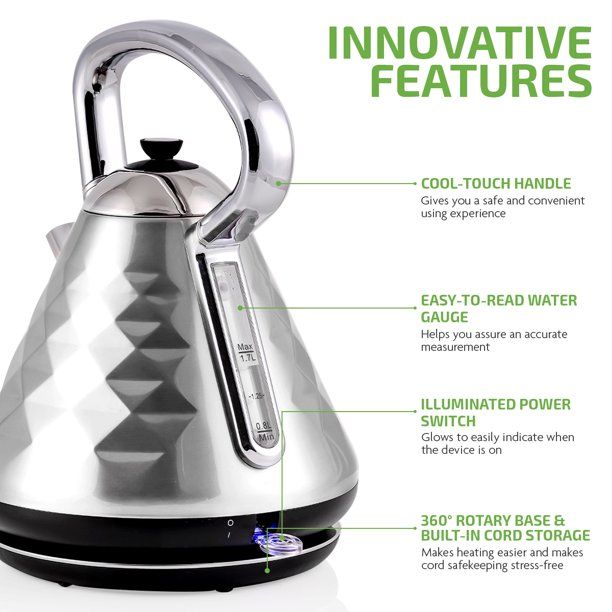 Innovative Features – As one of the leading brands in kitchenware technology, would like to introduce this premium-quality electric kettle with cool-touch handle; 360-degree rotary base and built-in cord storage; 1500-watt heating element; large, easy-to-read water gauge; illuminated power switch; and auto shut-off feature.