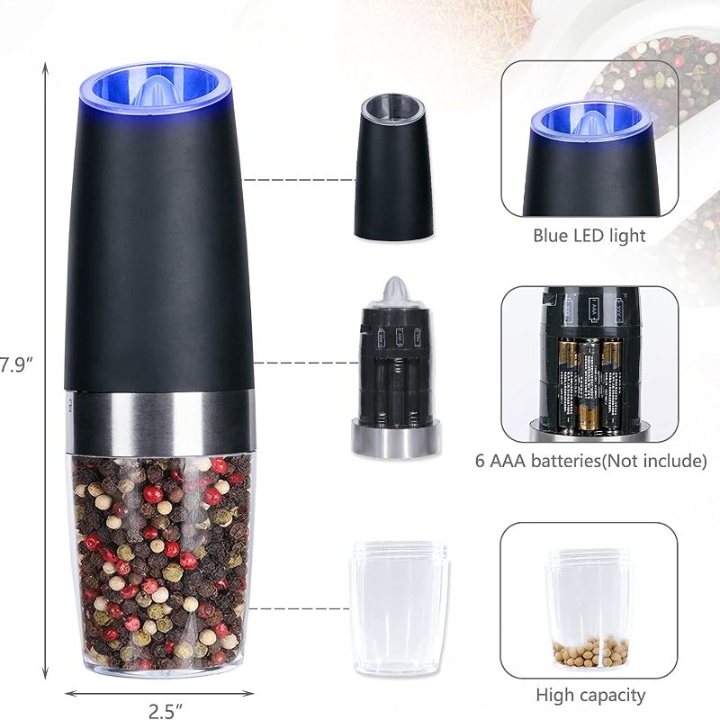 Electric Salt and Pepper Grinders Stainless Steel Automatic Gravity Herb Spice Mill Adjustable Coarseness Kitchen Gadget Sets - 1pcs Black is backordered and will ship as soon as it is back in stock.