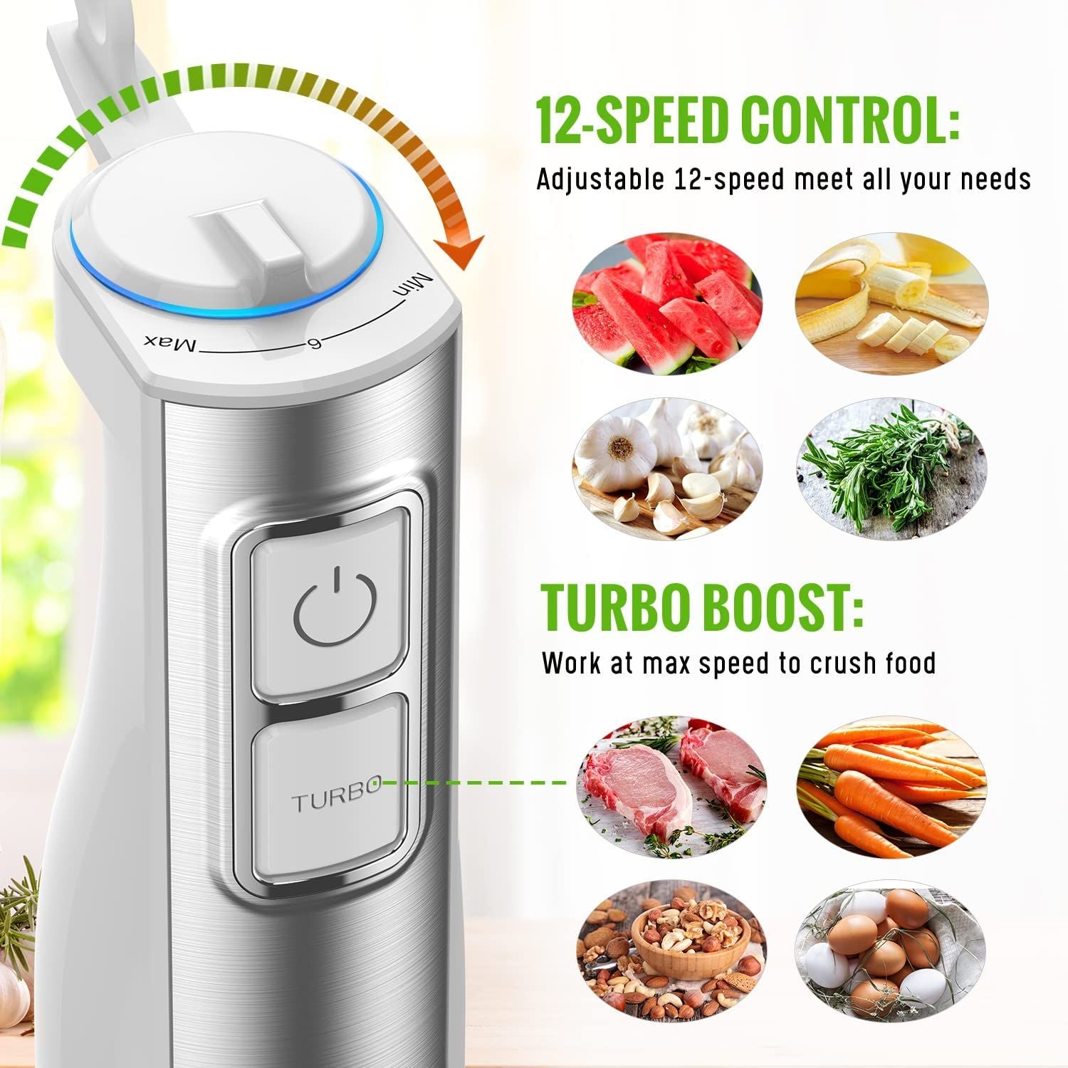 Limitless Power: Chop, puree and mix all ingredients to perfection in a flash with 1100W heavy-duty immersion hand blender copper motor. 12-speed/Turbo blending presets give you max control over your cooking