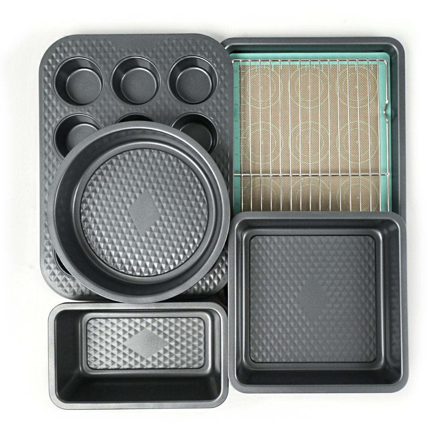 Set includes: 1 baking sheet(16”L x 11”W x 0.98”H) , 1 cup muffin pan(15.5”L x 11.2”W x 1.2”H) , 1 square pan(10”L x 10”W x 0.97”H) , 1 round pan(9.8”D x 1.97”H), 1 loaf pan(10”L x 6”W x 2.76”H) , 1 cooling rack(13.78”L x 9.45”W), 1 silicone mat(14.2”L x 9.8”W) and 1 storage organizer(15.8”L x 11.4”W x 4.5”H).