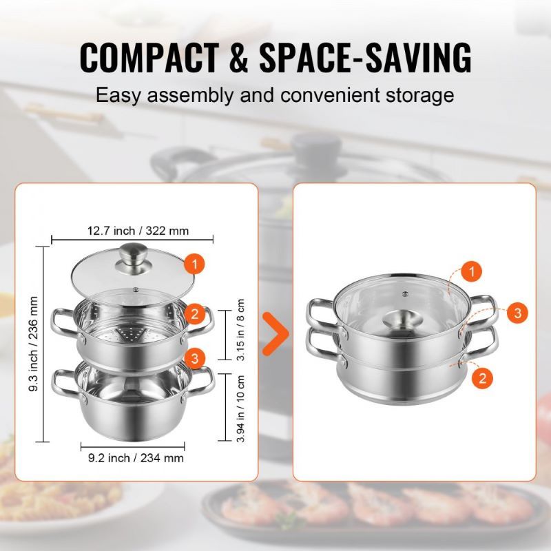 The stackable steamer cookware solves your storage problems and maximizes kitchen space utilization.