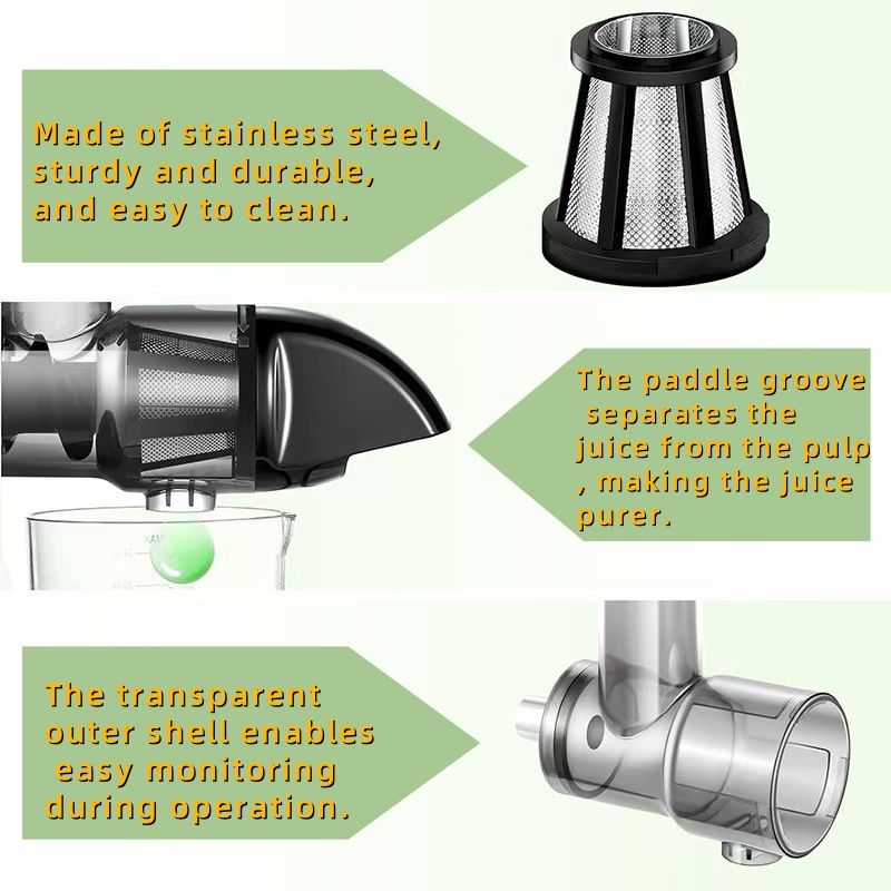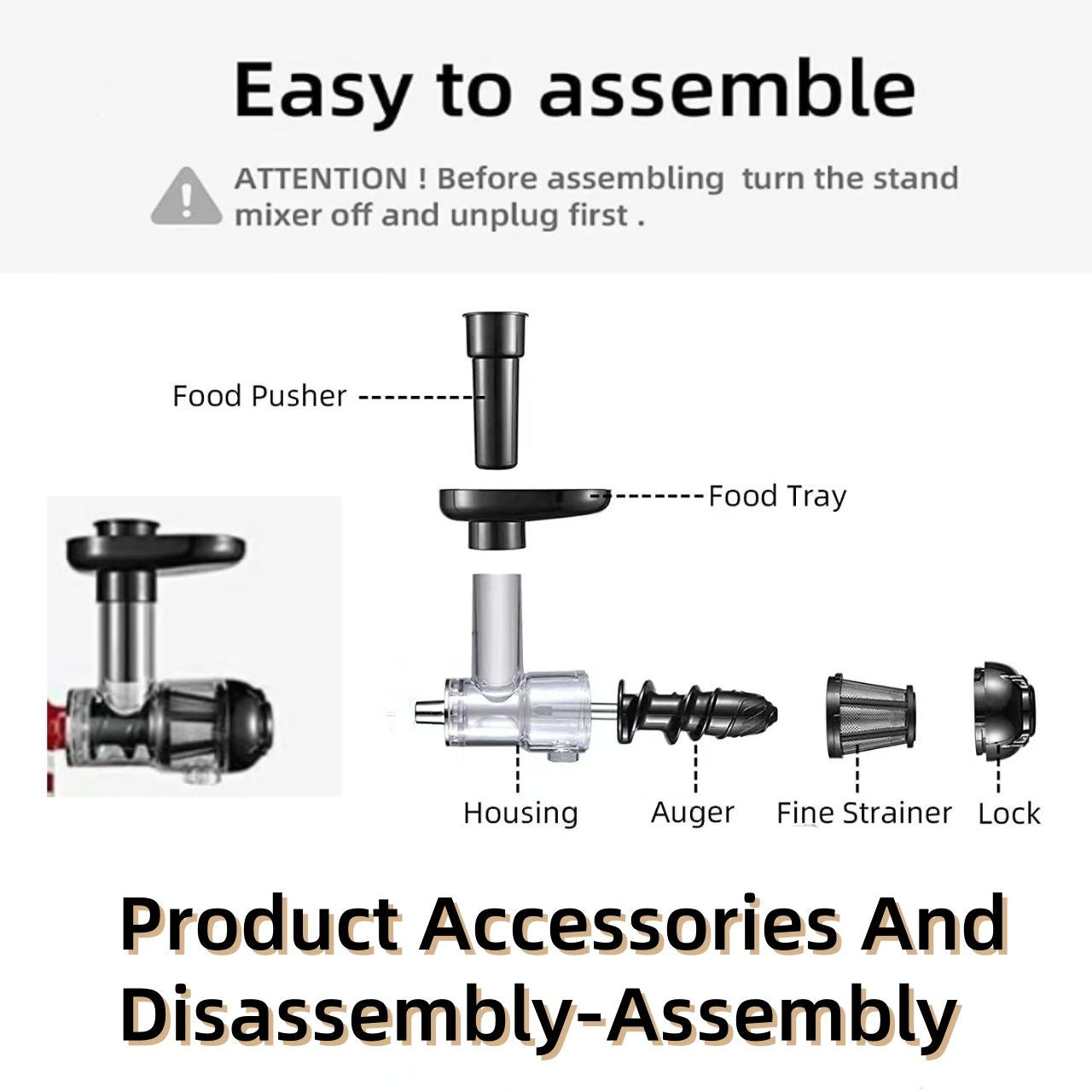 Easy installation: Turn off the stand mixer and unplug it before assembly. The inside of the juicer is made of stainless steel, durable and easy to clean; It has a transparent housing for easy monitoring during operation.