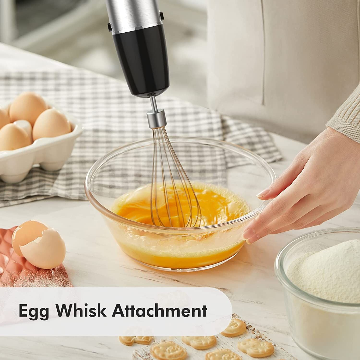 Perfect for whipping cream or egg whites, great assistance for cakes and desserts. Instead of hauling out the bulky table top mixer or tiring out your wrist and arm by hand whisking, use the stick blender to quickly whip up some billowy whipped cream. |