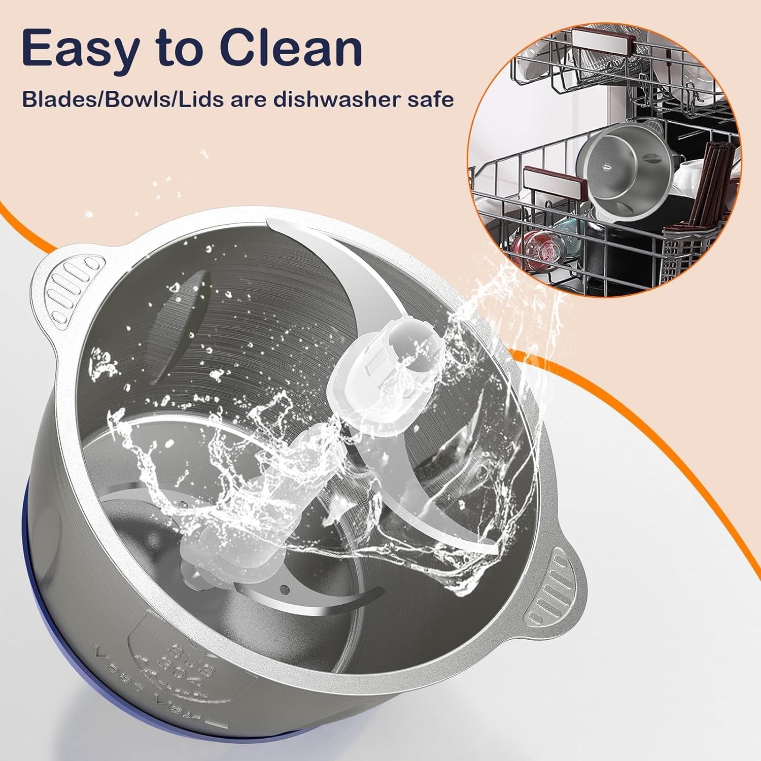 Not Being Another Task in Kitchen: All the parts including lid, blades, glass bowl are both detachable and dishwasher safe(except the motor). Moreover, you can just rinse it and set aside for drying. The 2L capacity bowls are stackable storage, which will save extra space for your kintchen