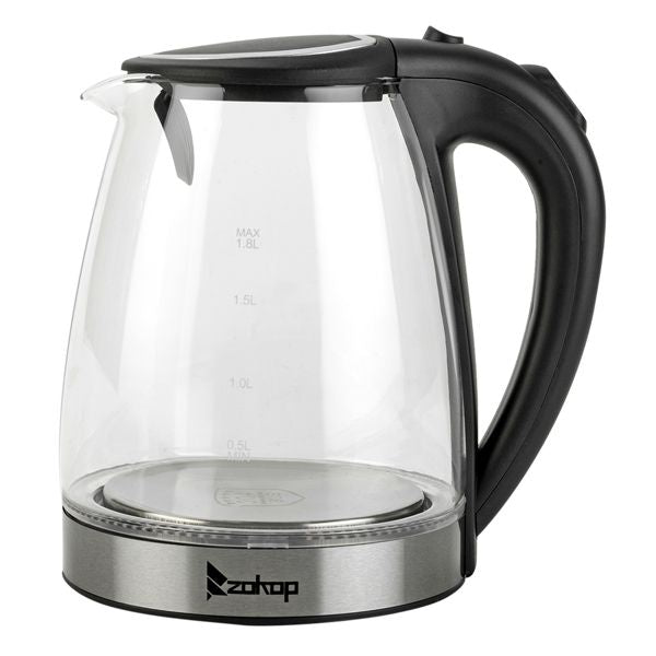 The ZOKOP HD-1857-A 110V 1500W 1.8L Electric Glass Kettle is the perfect blend of elegance and functionality. Not only is this kettle a beautiful addition to any kitchen countertop, but it also boils water efficiently, saving time and energy over the use of conventional stovetop kettles. A halo of blue LED lights beautifully illuminates the pot when it's in use, so it's not only practical, but very attractive to look at. In a matter of minutes, hot water will be ready to use for instant coffee, tea, hot cereal, instant macaroni, soup, or oatmeal.