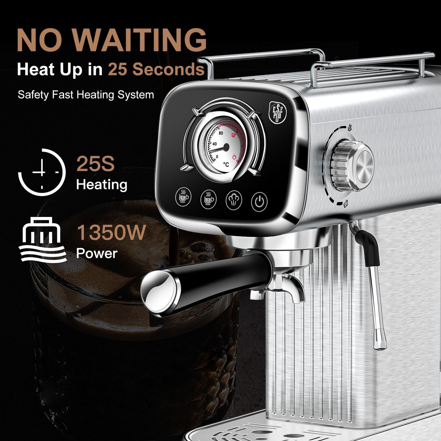 [Useful Tips]Built-in safety features like overpressure and overheating protection mode, making it a reliable choice for daily use. The coffee machine package contains: instruction manual*1, 2-cup filter*1, 1-cup filter*1, ESE pod filter*1, Measure scoop*1, Porta-filter*1.